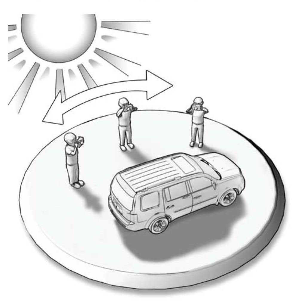 ^ Paint defects under the clear coat surface photograph better outside in natural light, with the sun low in the sky, behind the photographer, and facing the defect. The hours between 8-11 a.m. and 2-6 p.m. usually provide the best light to photograph defects within the paint, as the sunlight at these times allows you to see through the clear coat into the paint.
