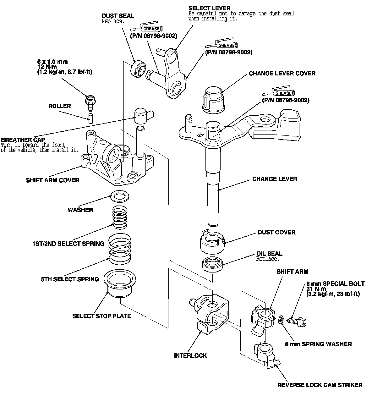 NOTE: Prior to reassembling, clean all the parts in solvent, dry them, and apply grease to contact surfaces as shown. Do not wash the rubber parts with solvent.