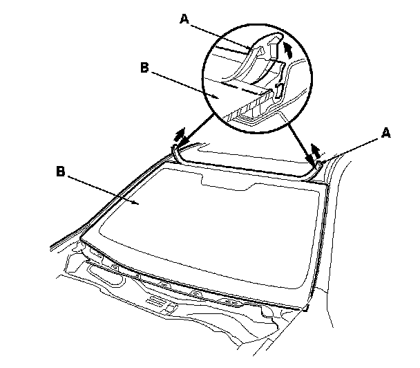2. Remove the molding (A) from the upper edge of the windshield (B). If necessary, cut the molding with a utility knife.