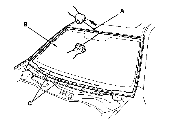 6. With a helper on the outside, pull the piano wire (A) back and forth in a sawing motion. Hold the piano wire as close to the windshield (B) as possible to prevent damage to the body and dashboard. Carefully cut through the rubber dam and adhesive (C) around the entire windshield.