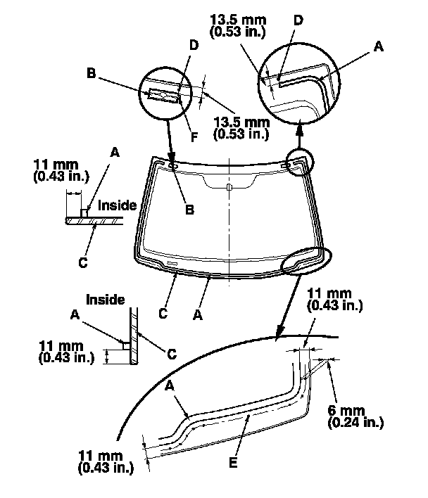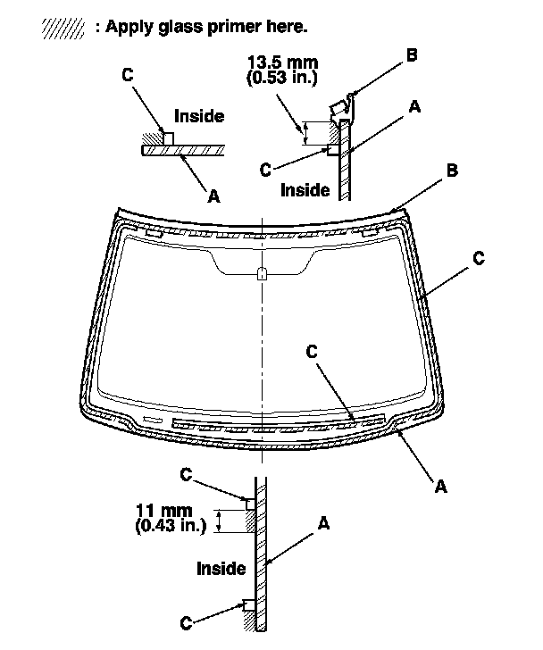 18. With a sponge applicator, apply a light coat of glass primer to the windshield (A) along the edge of the molding (B) and rubber dams (C) as shown, then lightly wipe it off with gauze or cheesecloth: