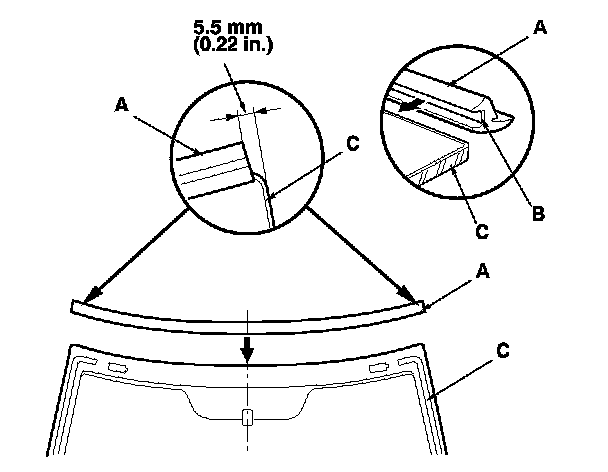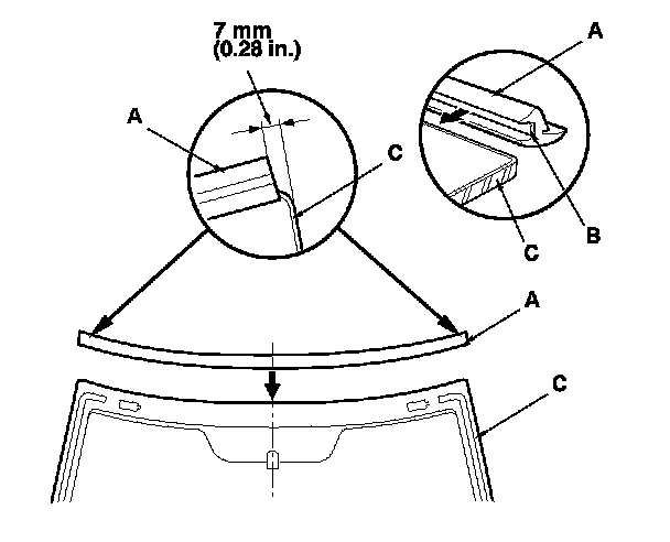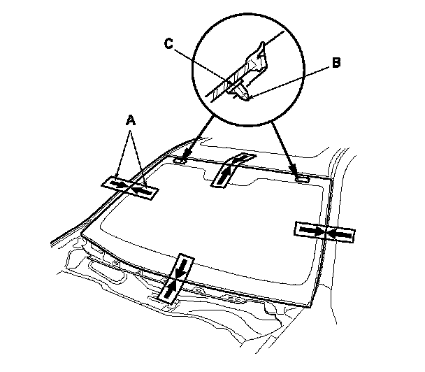 12. Attach the rubber dam A, and the upper clips (B) with adhesive tape to the inside face of the windshield (C) as shown. Before installing the upper clips, apply primer to the area where the adhesive tape will be applied to the inside face of the windshield: