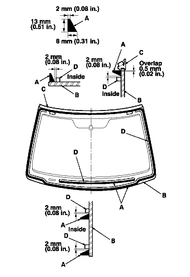 - With the edge (D) of the black ceramic on the windshield as a guide, attach the rubber dam B to the windshield.