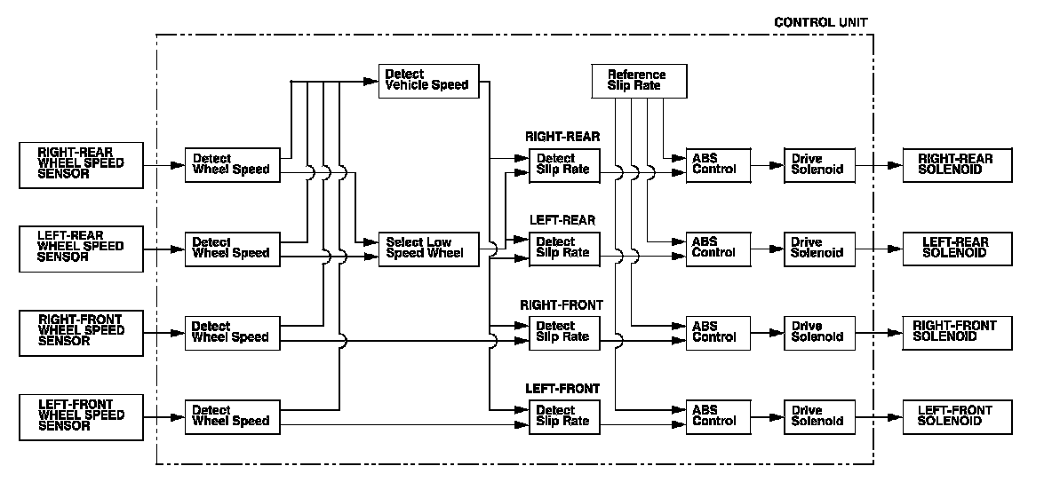 Without ABS, when the brake pedal is pressed while driving, the wheels sometimes lock before the vehicle comes to a stop. In such an event, the maneuverability of the vehicle is reduced if the front wheels are locked, and the stability of the vehicle is reduced if the rear wheels are locked, creating an extremely unstable condition. With ABS, the system precisely controls the slip rate of the wheels to ensure maximum grip force from the tires, and it thereby ensures maneuverability and stability of the vehicle. The ABS calculates the slip rate of the wheels based on the four wheel speeds, and then it controls the brake fluid pressure to reach the target slip rate.