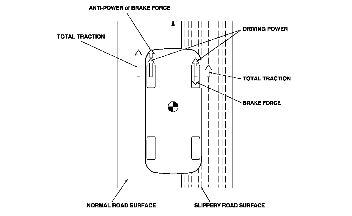 When a drive wheel loses traction on a slippery road surface and starts to spin, the VSA modulator-control unit applies brake pressure to the spinning wheel and sends an engine torque control request to the ECM/PCM to slow the spinning wheel and keep traction.