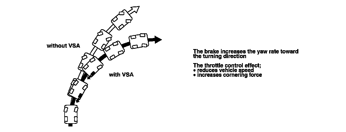 The hydraulic control has three modes of ABS action; pressure intensifying, pressure retaining, and pressure reducing. Pressure intensifying mode (VSA) is a combination of the TCS, VSA, and brake assist action.