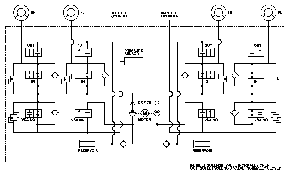 The hydraulic circuit is an independent four channel type; one channel for each wheel.