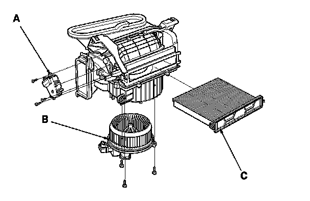 - The recirculation control motor (A), the blower motor (B), and the dust and pollen filter (C) can be replaced without removing the blower unit.