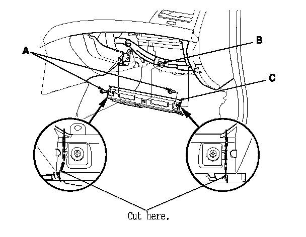 5. Remove the bolts (A) and the wire harness clip (B). Then cut the plastic cross brace (C) in the glove box opening with diagonal cutters in the area shown. Retain the plastic cross brace to be reinstalled later.