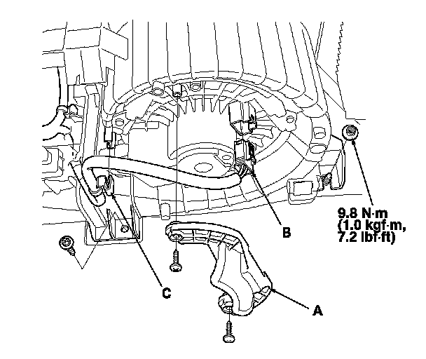 8. Disconnect the connector (B) from the blower motor and the wire harness clip (C). Remove the self-tapping screw and the mounting nut.