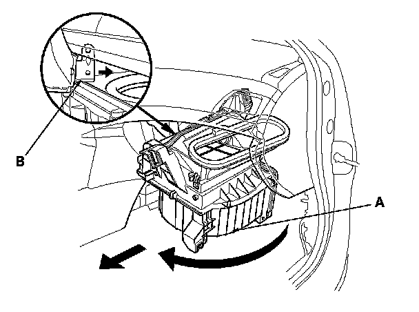 11. Pull the blower unit (A) out while rotating it clockwise as shown, so that the glove box bracket (B) passes through the dust and pollen filter area.
