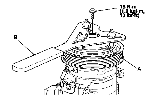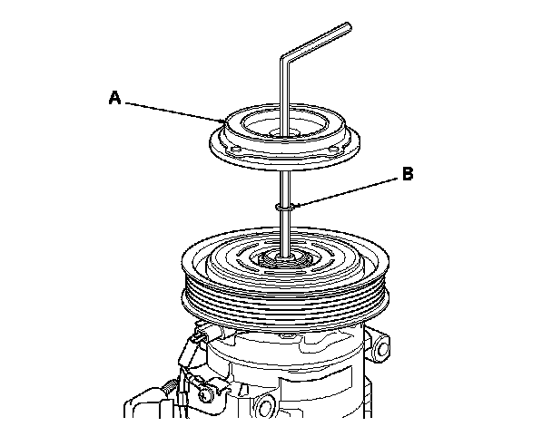 1. Remove the center bolt while holding the pressure plate (A) with a commercially available A/C clutch holder (B).