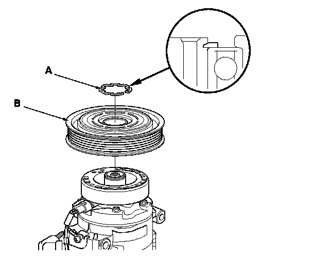 3. If you are replacing the field coil, remove the snap ring (A) with snap ring pliers, then remove the pulley (B). Be careful not to damage the pulley or the A/C compressor.