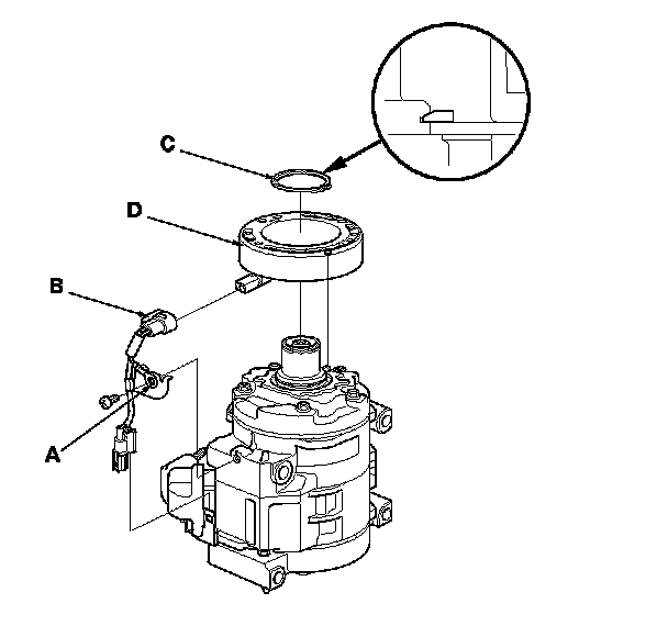 4. Remove the screw from the field coil ground terminal (A). Disconnect the connector (B) from the field coil, then remove the snap ring (C) with snap ring pliers, then remove the field coil (D). Be careful not to damage the field coil or the A/C compressor.