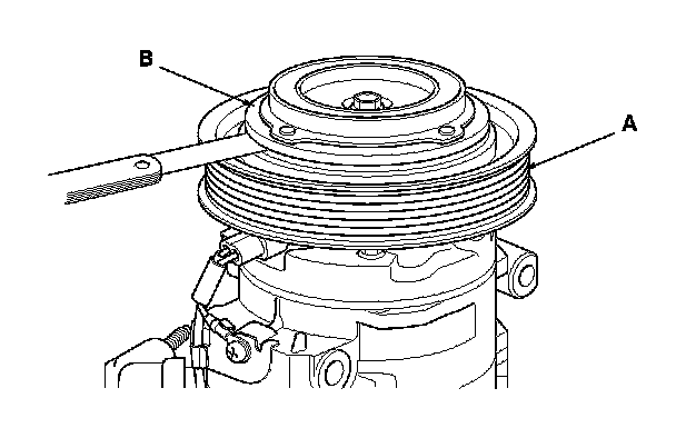 3. Measure the clearance between the pulley (A) and the pressure plate (B) all the way around. If the clearance is not within specified limits, remove the pressure plate Service and Repair and add or remove shims as needed to increase or decrease clearance.