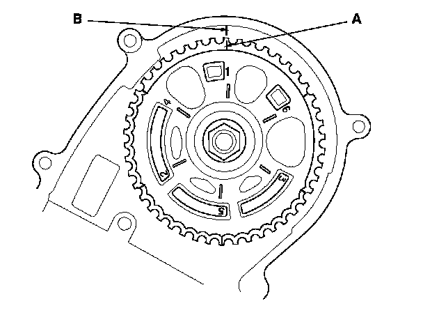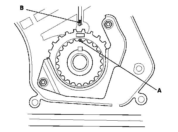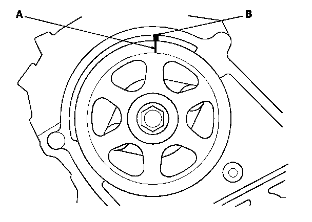 2. Set the timing belt drive pulley to top dead center (TDC) by aligning the TDC mark (A) on the tooth of the timing belt drive pulley with the pointer (B) on the oil pump.