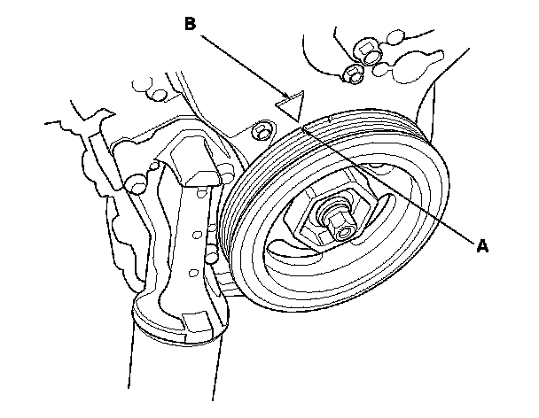 15. Turn the crankshaft pulley so its white mark (A) lines up with the pointer (B).