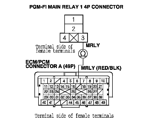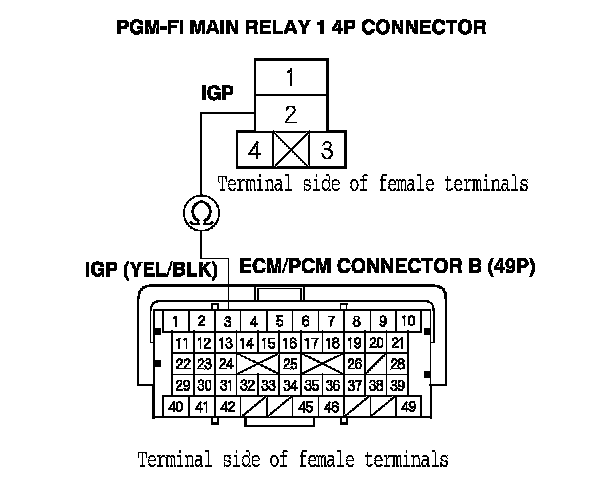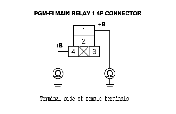 40. Check for continuity between body ground and PGM-FI main relay 1 4P connector terminals No. 1 and No. 4 individually.