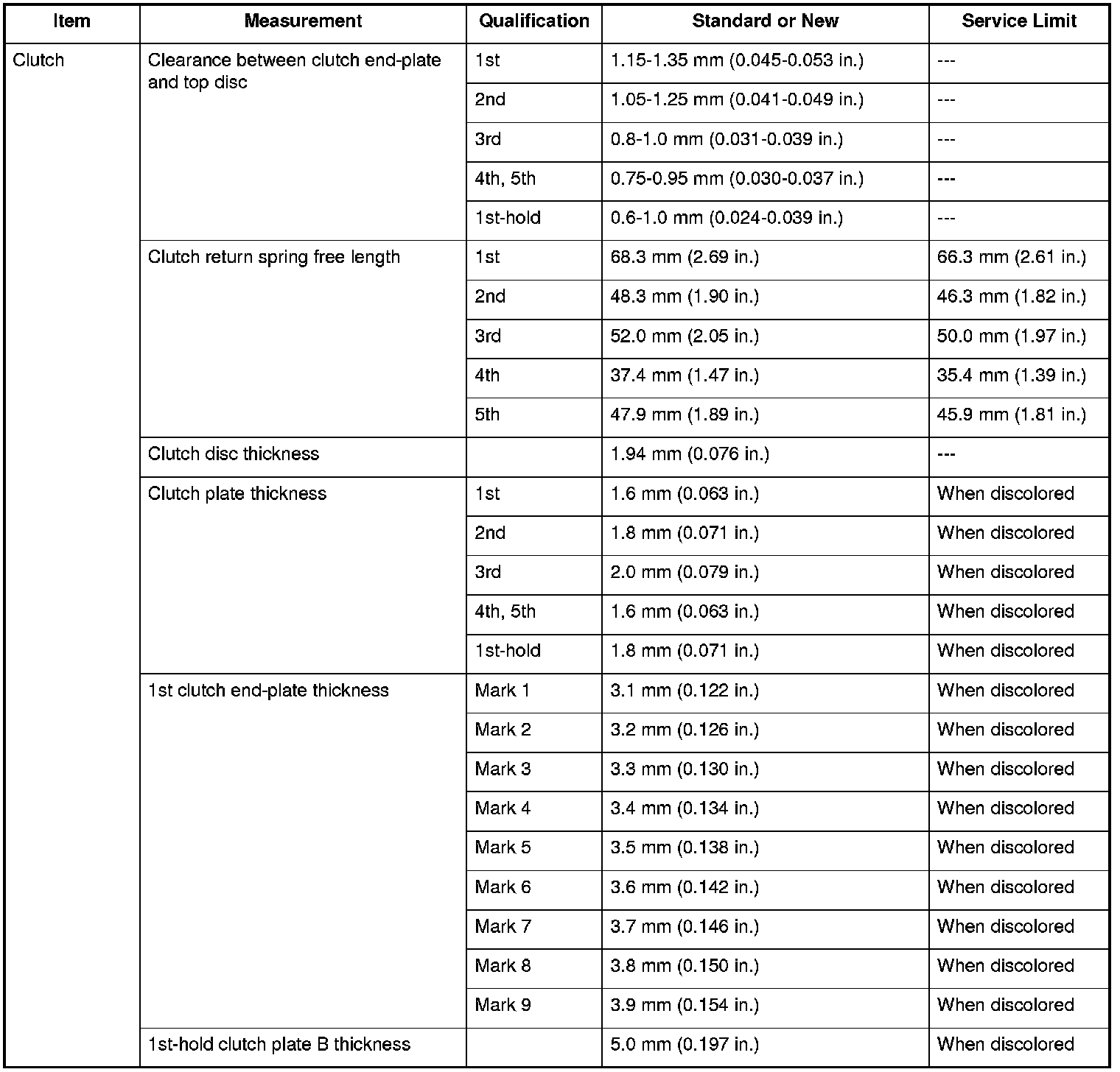 Clutch Specifications (A/T)