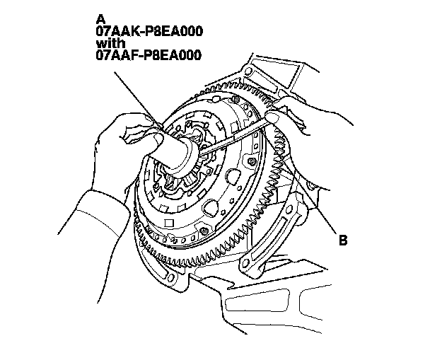 2. Check the evenness of the height of the diaphragm spring fingers using the clutch alignment shaft, the stop collar (A), and a feeler gauge (B). If the height difference is more than the service limit, replace the pressure plate and clutch disc as a set.