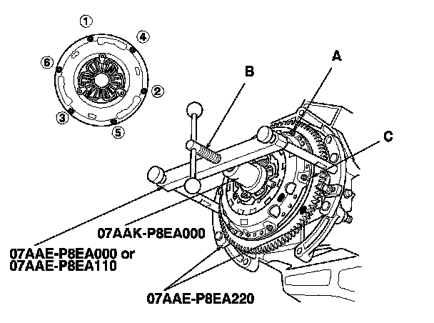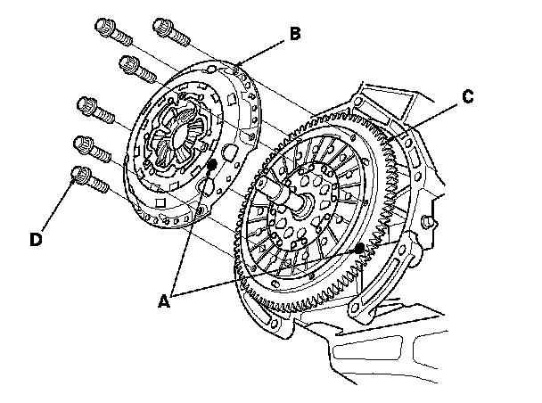29. Align the point marks (A) across the pressure plate (B) and the flywheel (C).