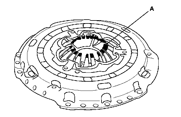 8. Inspect the fingers of the diaphragm spring (A) for wear at the release bearing contact area.