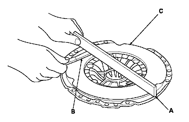 10. Inspect for warpage using a straight edge (A) and a feeler gauge (B). Measure across the pressure plate (C). If the any measured point is more than the service limit, replace the pressure plate and clutch disc as a set.