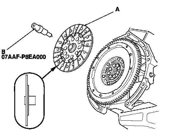 11. Remove the clutch disc (A) and the clutch alignment shaft (B).