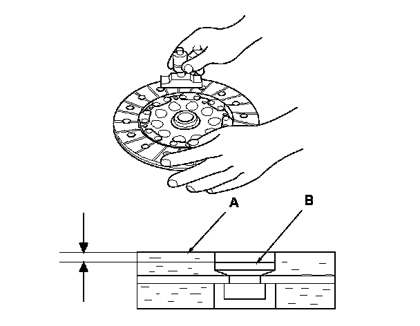 14. Measure the depths of the rivets from the clutch disc lining surface (A) to the rivets (B) on both sides. If the measurement is less than the service limit, replace the clutch disc and pressure plate as a set.