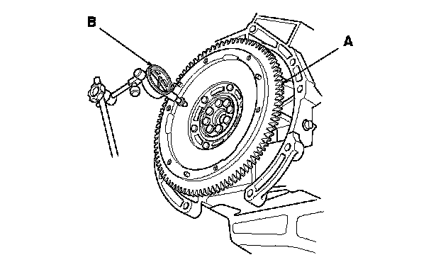 17. Measure the flywheel (A) runout using a dial indicator (B). Through at least two full turns with pushing against the flywheel each time you turn it to take up the crankshaft thrust washer clearance. If the measurement is not within the standard, replace the flywheel, and recheck the runout; go to step 19.