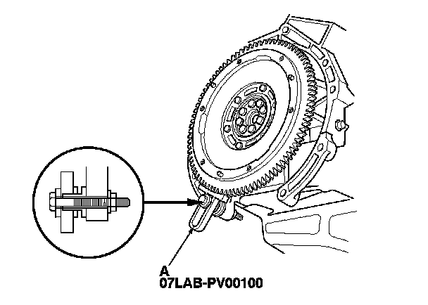 24. Install the ring gear holder (A), then torque the flywheel mounting bolts (B) in a crisscross pattern in several steps. Do not use impact tools to tighten the flywheel bolts. Using impact tools may permanently damage the flywheel.