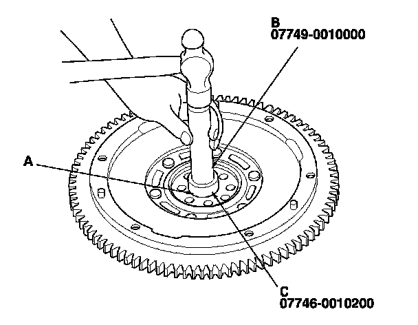 22. Install the new pilot bearing (A) into the flywheel using the 15 x 135L driver handle (B) and the 37 x 40 mm bearing driver attachment (C). Apply a light coat of oil to the bearing outer surface.