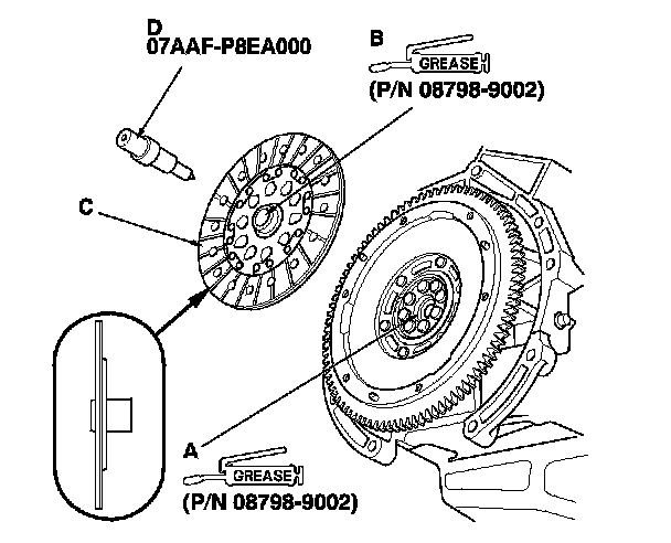 28. Apply super high temp urea grease (P/N 08798-9002) to the splines (B) of the clutch disc (C), then install the clutch disc using the clutch alignment shaft (D).