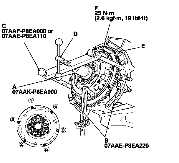 33. Be careful not to damage the pressure plate (E). Tighten (180 degrees apart) the pressure plate mounting bolts (F) in the pattern as shown in several steps.