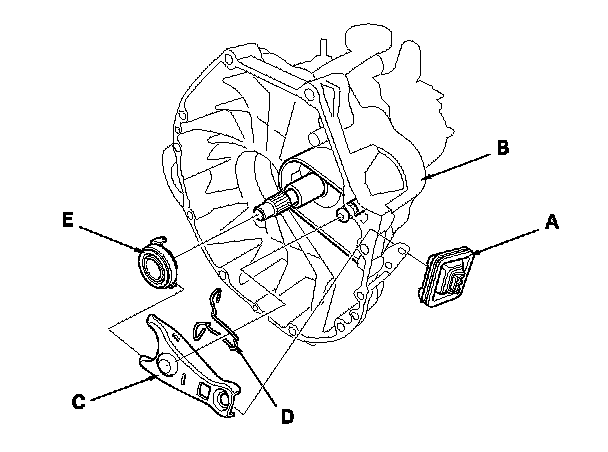 3. Remove the release fork (C) from the clutch housing by squeezing the release fork set spring (D). Remove the release bearing (E).