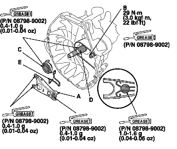 5. Apply super high temp urea grease (P/N 08798-9002) to the release fork (A), the release fork bolt (B), the release bearing (C), and the release bearing guide (D) in the shaded areas, then set the release fork set spring (E).