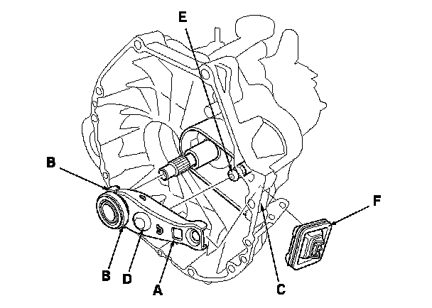 8. Install the release fork boot (F). Make sure the boot seals around the release fork and clutch housing.