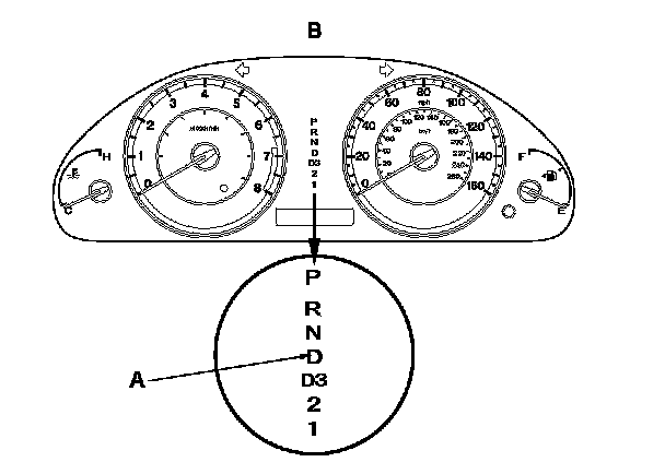When the powertrain control module (PCM) senses an abnormality in the input or output system, the D indicator (A) in the gauge control module (B) will usually blink.