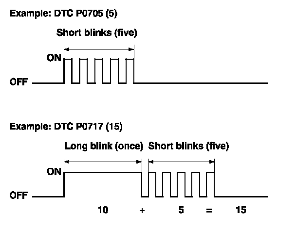 3. Select SCS mode, then observe the D indicator in the gauge control module. Codes 1 through 9 are indicated by individual short blinks. Code 10 and above are indicated by a series of long and short blinks. One long blink equals 10 short blinks. Add the long and short blinks together to determine the code.