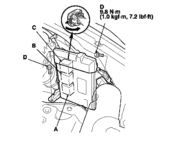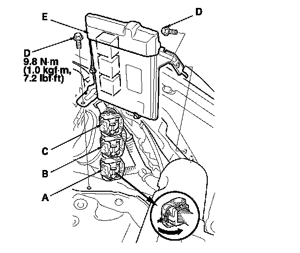 9. Disconnect PCM connectors A, B, and C, then remove the PCM assembly (E).