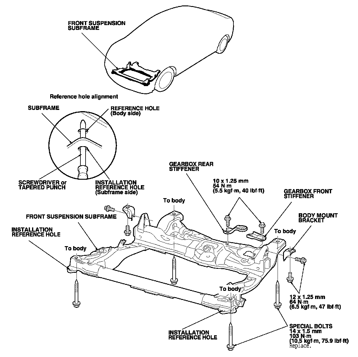 - When installing, align both installation reference holes in the subframe with both reference holes in the body using a screwdriver or tapered punch as a guide.