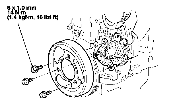 4. Remove the water pump pulley mounting bolts.