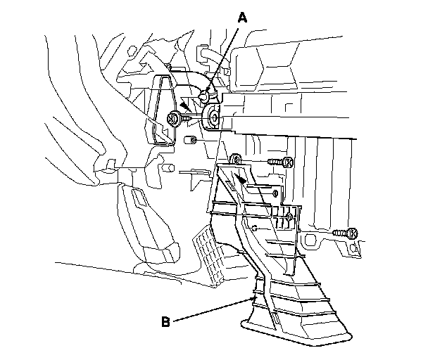 4. Remove the wire harness clip (A), the self-tapping screws, and the passenger's heater duct (B).