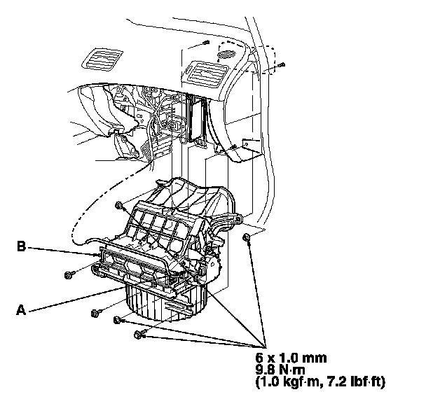 6. Disconnect the connector (A) from the recirculation control motor. Remove the self-tapping screws, the bolt, the mounting nuts, and the blower unit (B).