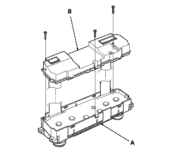 3. Remove the self-tapping screws, then carefully separate the climate control unit display (A) from the control unit (B). Do not kink or pull on the wires between the display and the control panel. Do not touch the electronic components on the printed circuit board in the control panel.