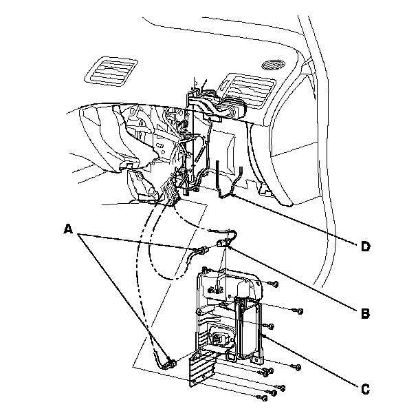 6. Disconnect the connectors (A) from the evaporator temperature sensor and the power transistor, then remove the connector clip (B). Remove the self-tapping screws, the expansion valve cover (C), and the seal (D).