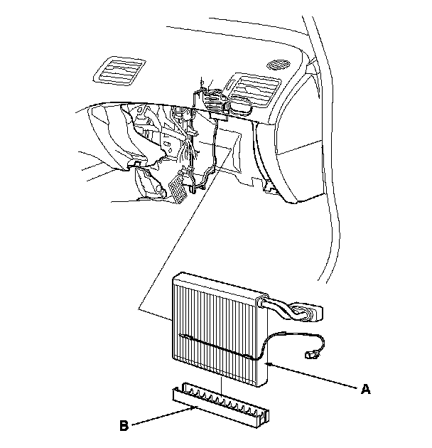 7. Carefully pull out the evaporator core (A) without bending the lines, then remove the plate (B).