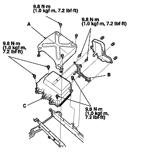 2. Remove the cover (A), the busplate (B), and the MCM (C).