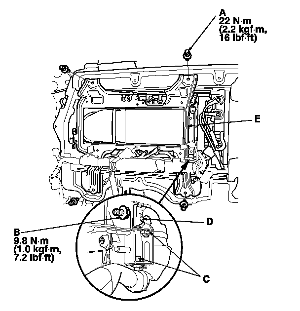 11. Remove the bolt (B) and the clamps (C), then disconnect the MCM connector (D).