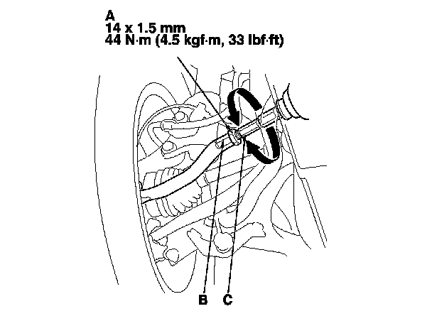 3. Loosen the tie-rod locknuts (A) while holding the flat surface sections (B) of the tie-rod end with a wrench, and turn both tie-rods (C) until the front toe is within specifications.